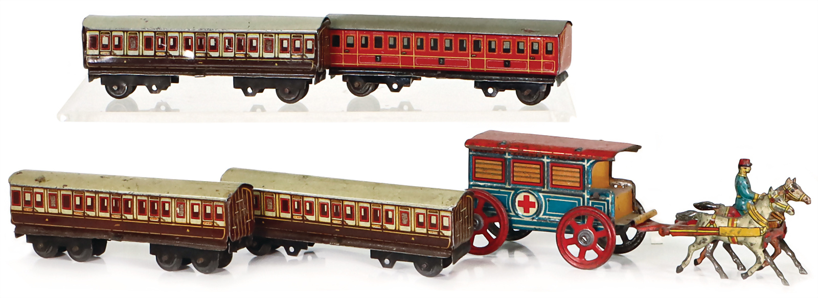 Pennytoy, Blech, lithogr., 4 Personenwagen, 1 Kutsche, rotes Kreuz, Blech, lithogr., besp. Zust.
