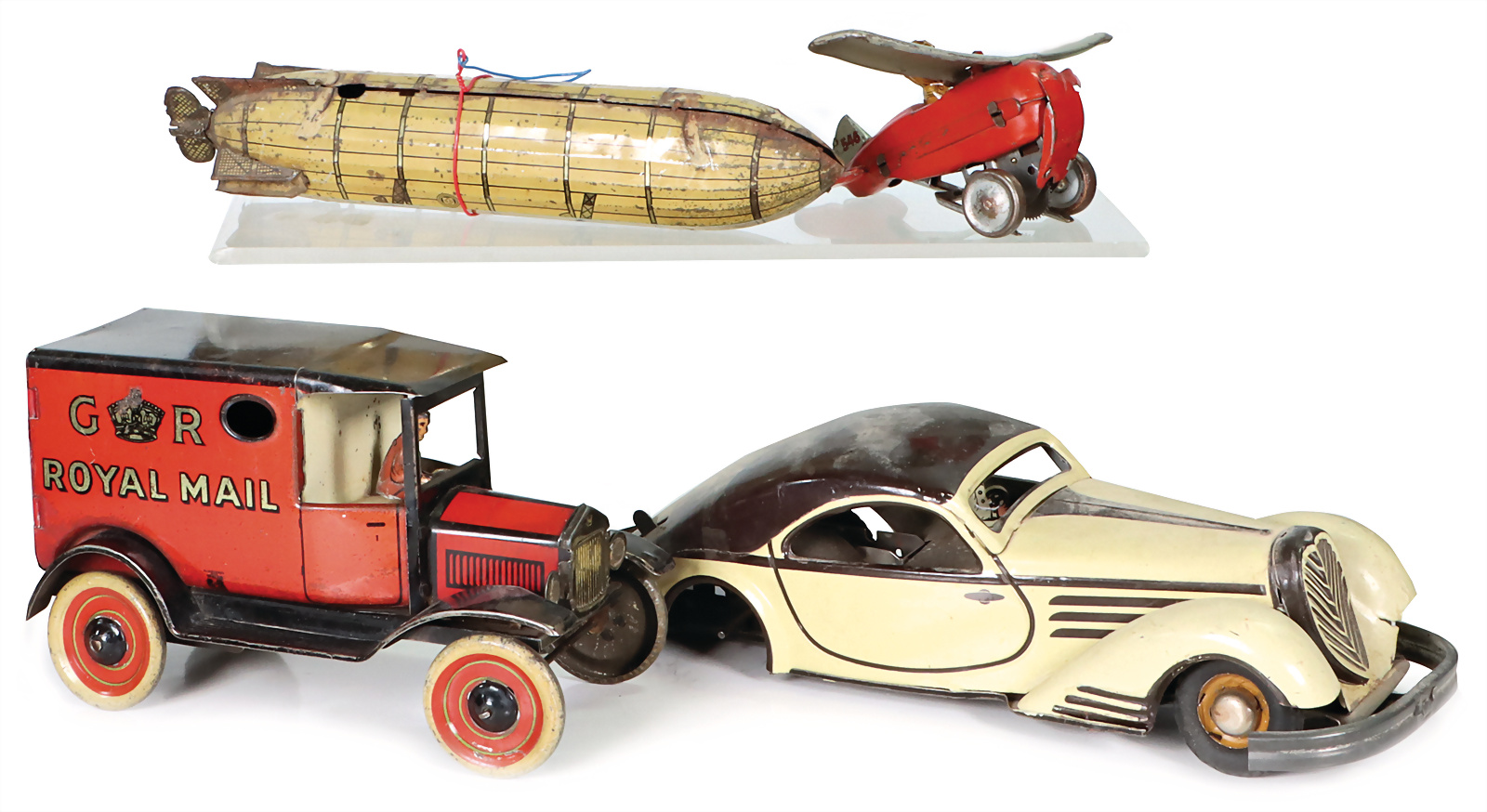 Konv. 4 Teile., Flugzeug, Blech, lithogr., Aero, Uhrwerk intakt, besp. Zust., Zeppelin, Blech, L: 22 cm, besp. Zust., Limousine, Blech, lithogr., ein Rad fehlt, besp. Zust., L: 28 cm, Automobil, Royal Mail, Blech, lithogr., besp. Zust., L: 16,5 cm