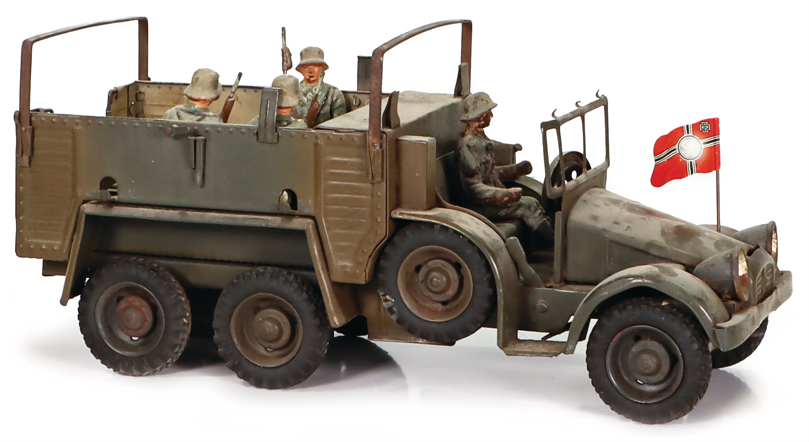 Mannschaftswagen, mit 3 Mann Besatzung, ein Fahrer, altersbedingt verstaubt, Wehrmacht, Blech, leichter Flugrost, L: 25 cm, Uhrwerk intakt, Plane fehlt