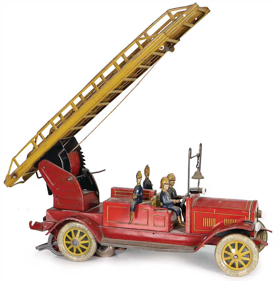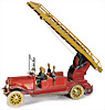 Feuerwehrwagen mit Drehleiter, Blech, lithogr., 4 Mann Besatzung, verstaubt, L: 40 cm, zwei Mann fehlen