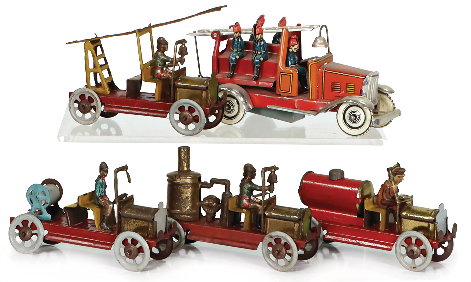 Pennytoy, Konv., 5 Teile, Feuerwehrautos, Leiterwagen, Spritzenwagen, guter bis besp. Zust., versch. Größen, Blech, lithogr.