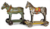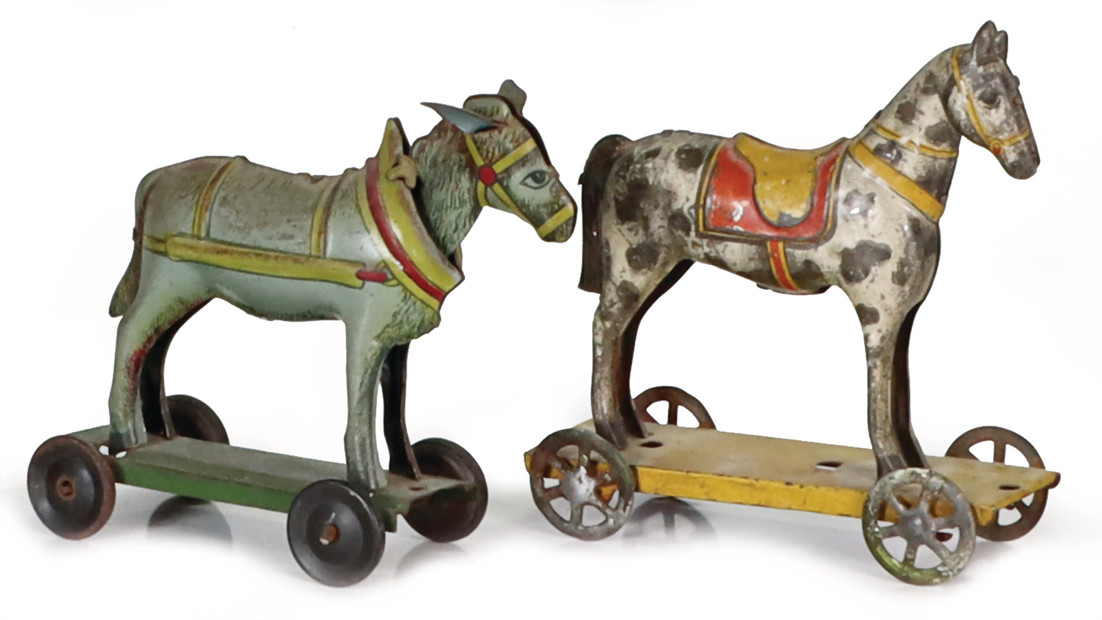 2 Teile, Blech, Pferd u. Esel, Blech, lithogr., Esel Kopfnicker, H: 8 cm