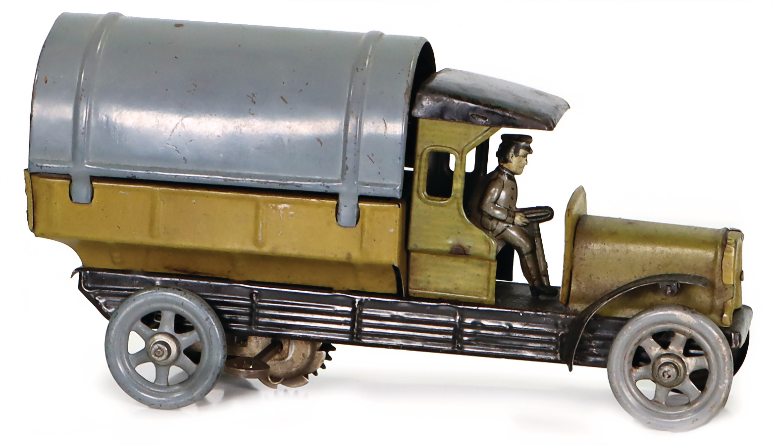 Planwagen, Blech, lithogr., altersbedingt Lackschäden, teils farblich etwas nachgebessert, Uhrwerk defekt, L: 20 cm