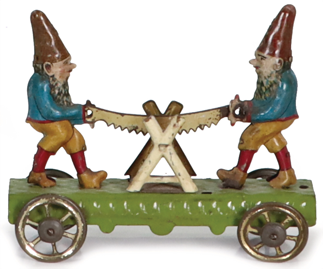 Blech lithogr., 2 Zwerge an der Säge, H: 7 cm, leicht bespielt, guter Zust.