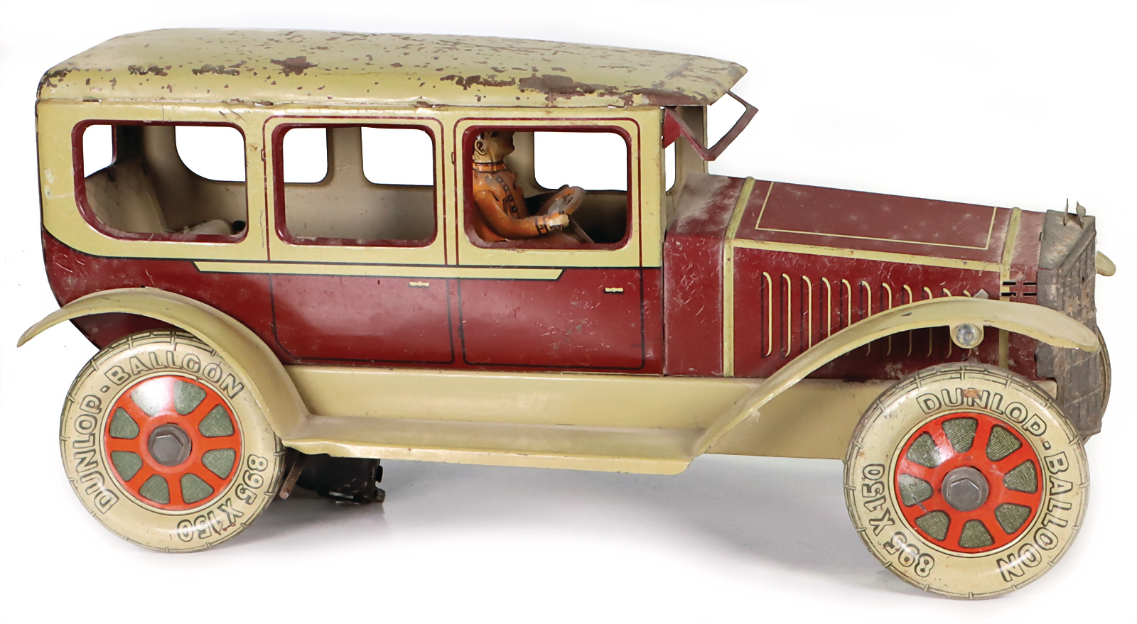 Limousine, Blech, lithogr., hintere Achse lose, bespielt. Zustand, Lackfehler, 20er Jahre, rechter Frontscheinwerfer fehlt, D. R. P. 465774, L: 32 cm