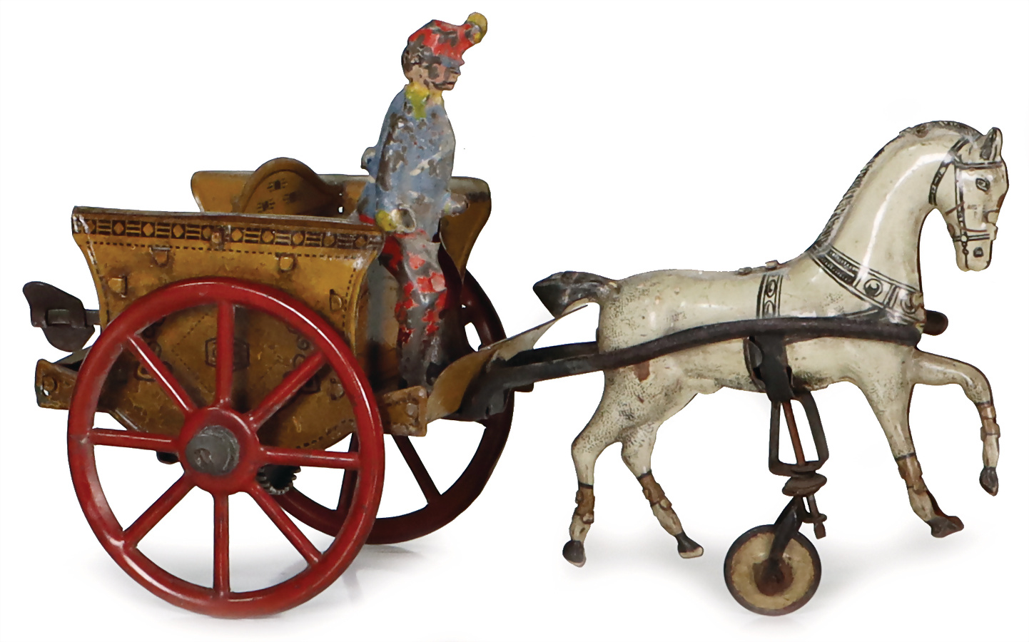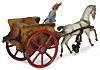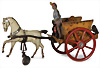 Pferdewagen mit Uhrwerk, ca. 1905–1915, Blech, lithogr., altersbedingt min., Lackschäden, sonst sehr schöner Zustand, mit Uhrwerk, L: 16 cm, made in Germany