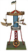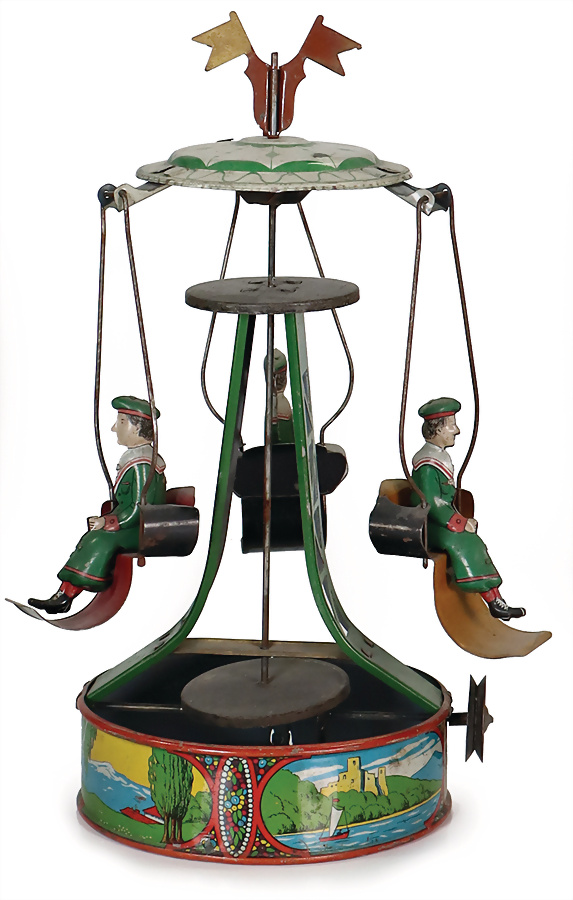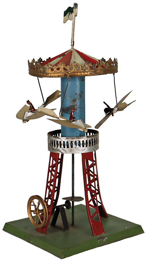 Fliegerkarussell, H: 33 cm, mit Fahne gerechnet, Blech, handlackiert, deutsch, 3 Flugzeuge (müssen am Gestänge neu befestigt werden), bespielt, gut