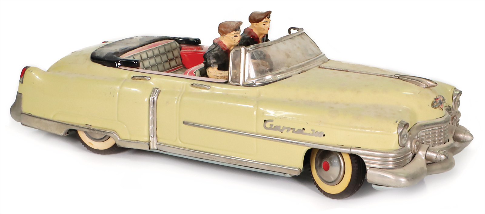 300 Cadillac Cabrio, Blech, mit Fahrer und Beifahrer, leicht bespielter Zustand, gut, Friktionsantrieb, Blech, L: 30 cm