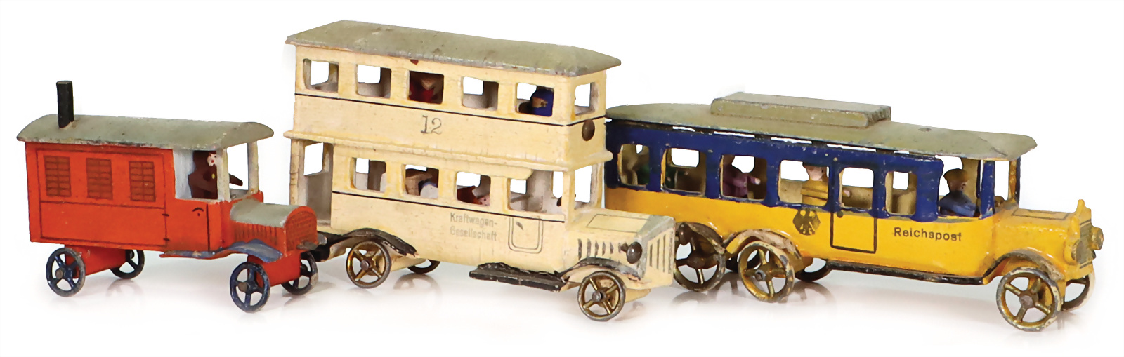 3 Artikel, Bus, Reichspost, blau, gelb, min. Farbabrieb, teils farblich etwas nachgebessert, sonst gut, 12,5 cm, Lieferwagen, orange, guter Zust., Doppeldecker, Kraftwagen Gesellschaft, ein Vorderrad fehlt, altersbedingt min. Rissbildungen, sonst gut, Länge 10 cm