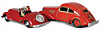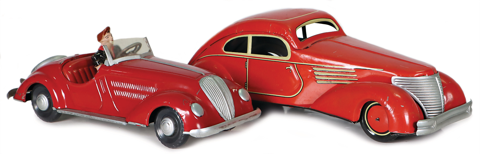 2 Art., Sportwagen, Cabrio, Blech, min., Lackschäden, mit Fahrradfigur, Uhrwerk intakt, L: 23 cm, Limousine, Blech, lithogr., Uhrwerk intakt, IA -57002, L:29 cm