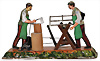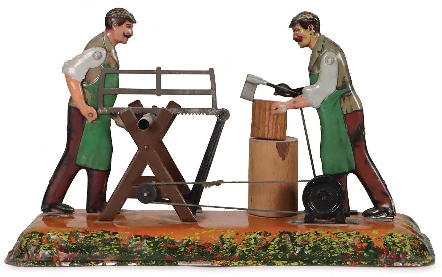 Sägewerk mit zwei Arbeitern, ca. 1910–1928, Blech, Hand lackiert, Funktion intakt, altersbedingt min. Lackschäden, etwas verstaubt, L: 25 cm, H: 15 cm