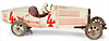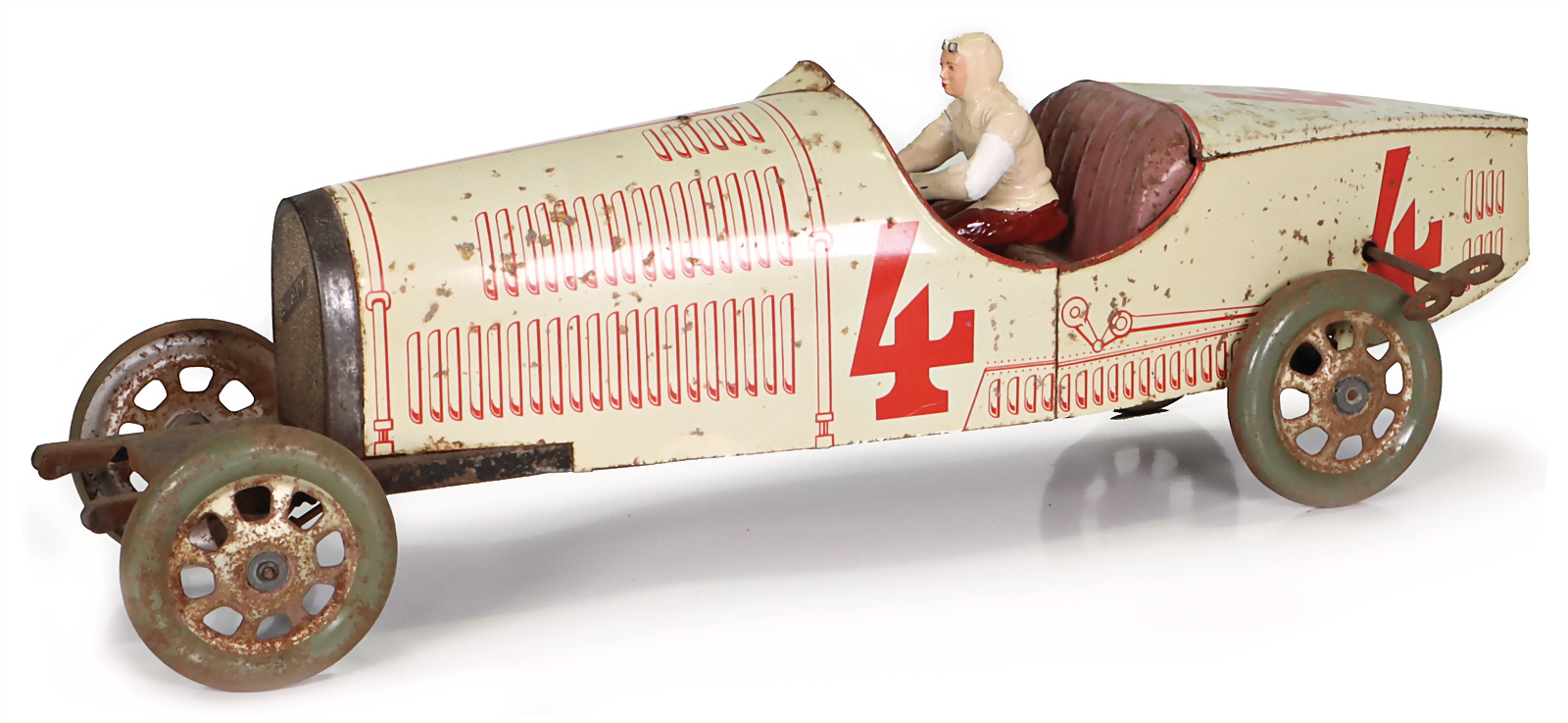 Rennwagen, Blech lithogr., Frankreich, leichter Flugrost, besp. Zust., Uhrwerk intakt, mit Fahrerfigur, nicht orig., Figur ausgebessert, Masse, um 1930, L: 44 cm