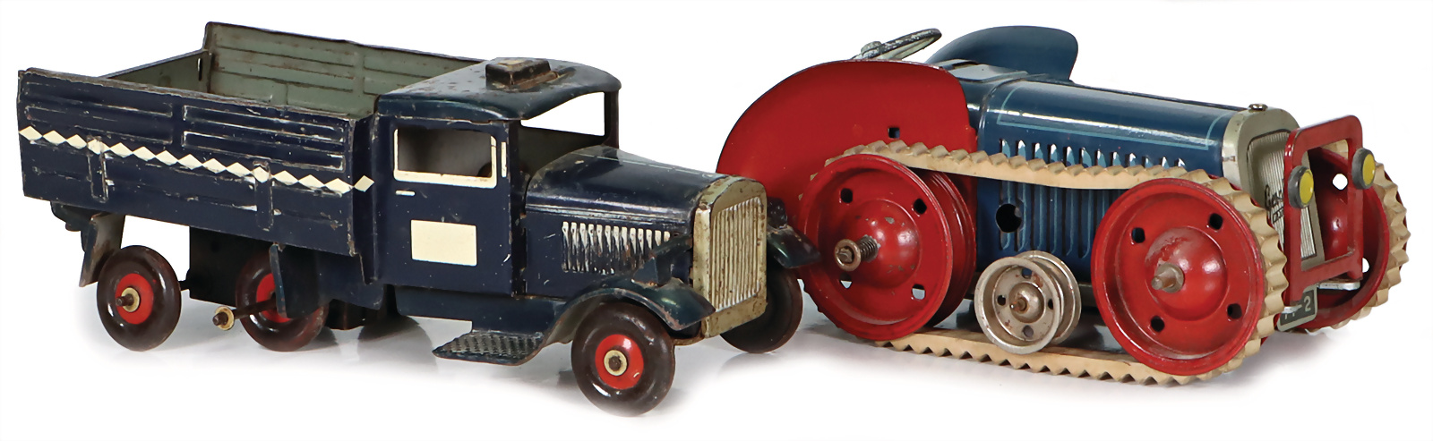 2 Art., Gescha, Traktor, 71 - 2, mit Gummikette, Uhrwerk intakt, min., Lackschäden, sonst gut, L: 17 cm, Lkw, Blech, bespielte Zustand, L: 20 cm