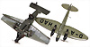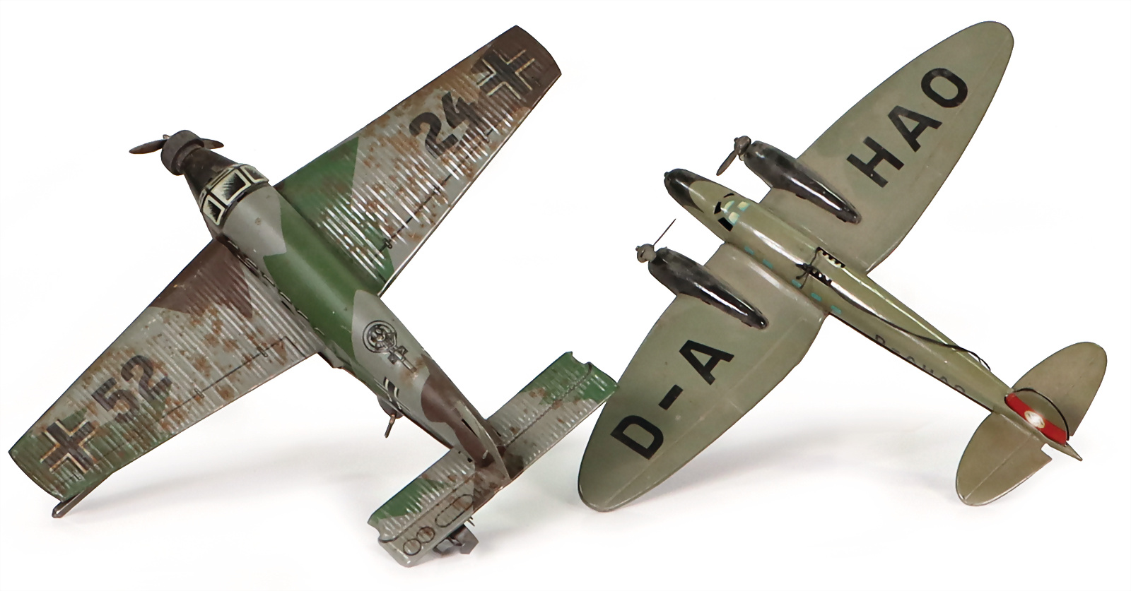 1 x Flugzeug, LEHMANN, D - AHAO, je ein Blatt beim Propeller abgebrochen, Made in Germany, L: 13 cm, 1 x Flugzeug, Blech lithogr., Uhrwerk intakt, Flugrost, L: 15 cm