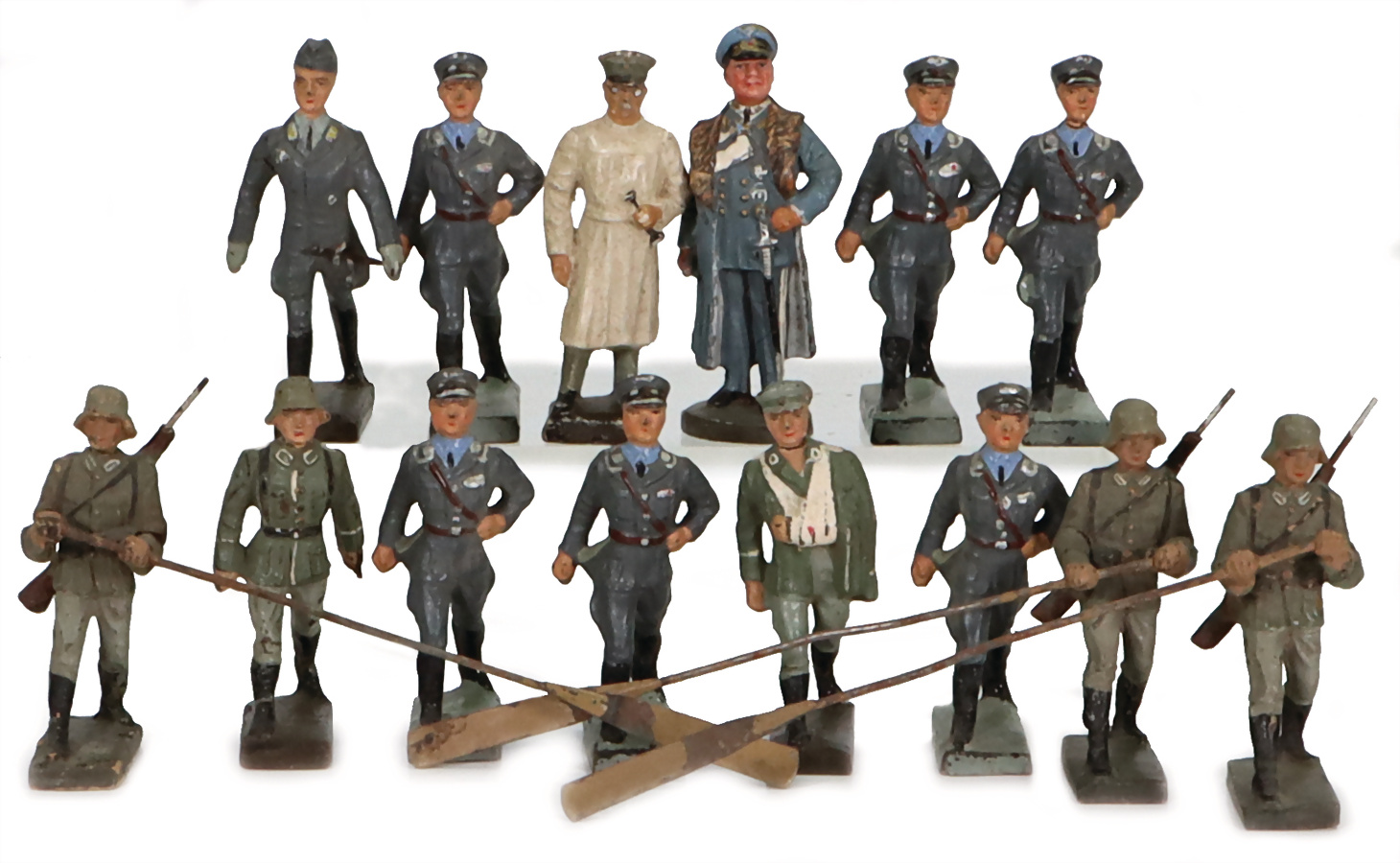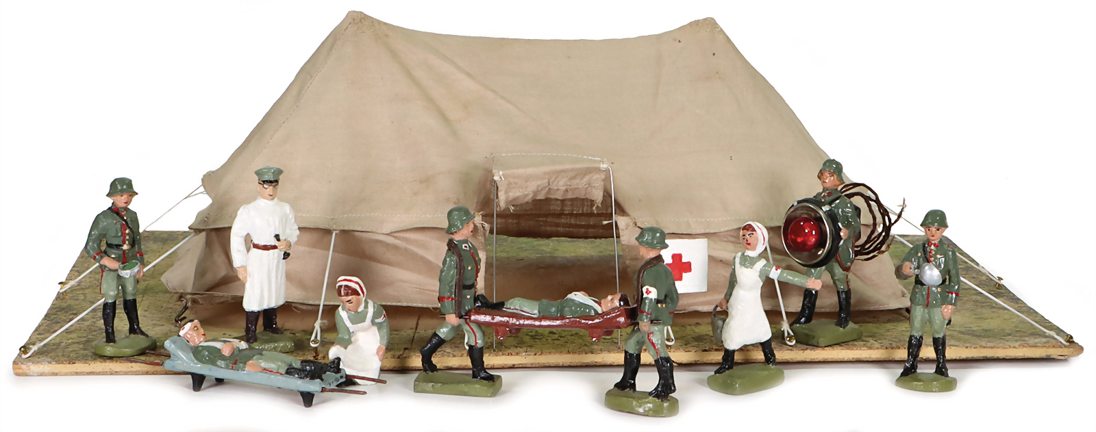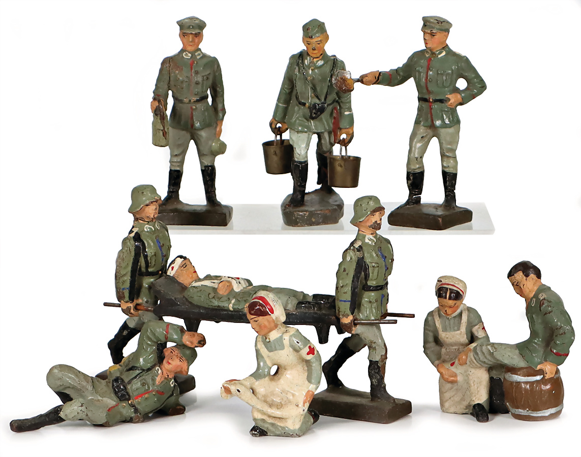 2ter Weltkrieg, Massefiguren, rotes Kreuz, Sanitäterin, Sanitäter, Arzt, zwei Soldaten mit Schöpfkelle, ein Soldat mit Scheinwerfer, meist guter Zustand, teils farblich etwas nachgebessert, 7 cm 8 Art., dazu Sanitäter Zelt