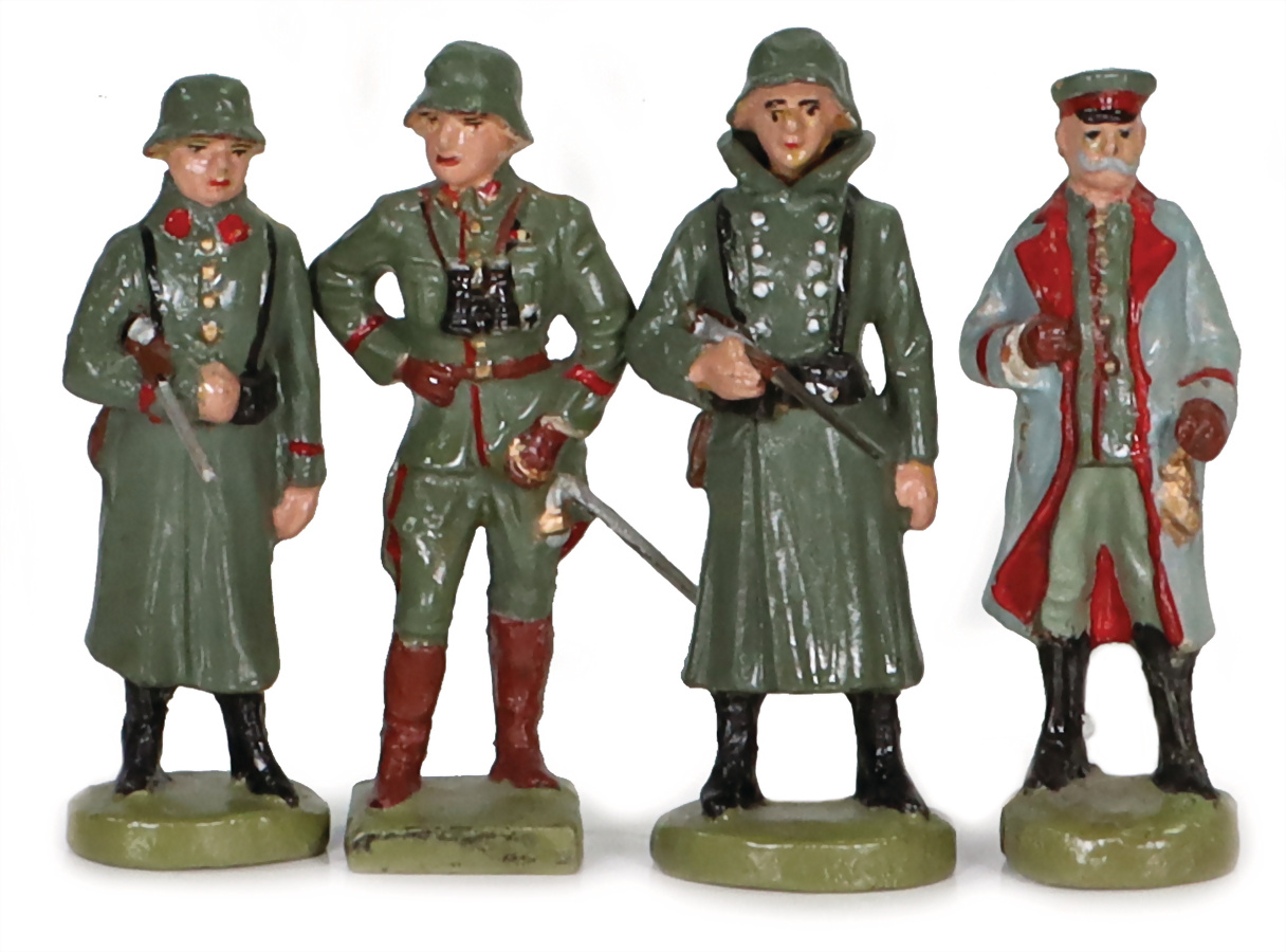 Lineol, Massefiguren, 2. Weltkrieg, Persönlichkeiten, marschierende Soldaten, 3 x mit Paddel in der Hand, bespielter Zust.