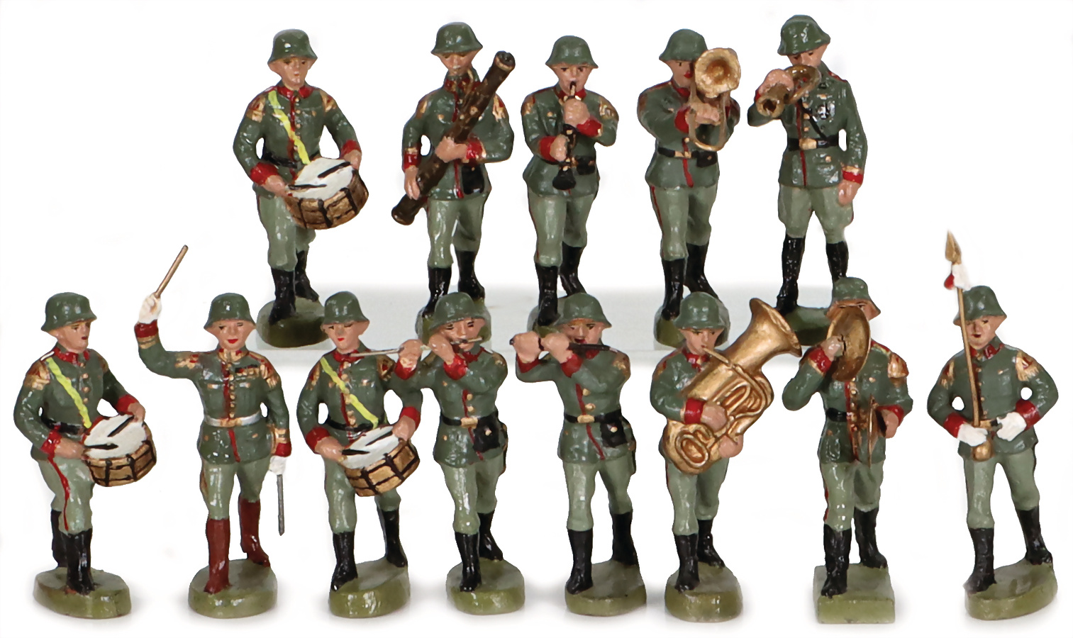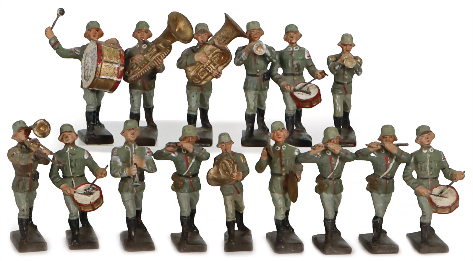 Konvolut, Musikanten, marschierend, 7 cm, 13 Art., guter Zustand, teils farbig etwas nachgebessert