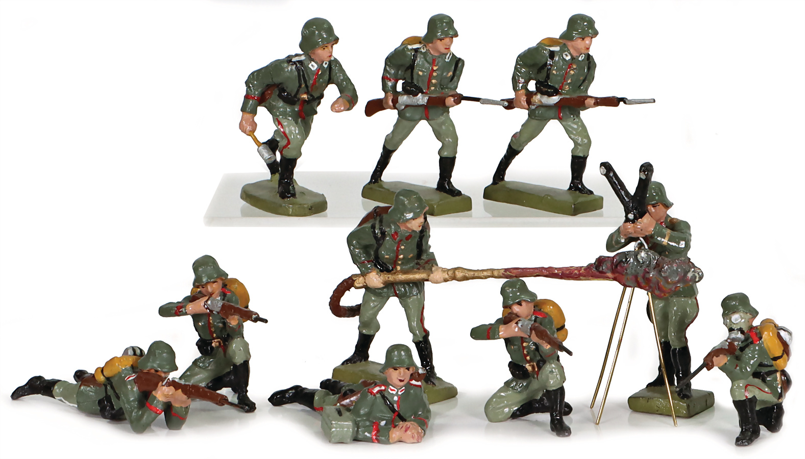 Konv., Soldaten, 2ter Weltkrieg, kämpfend, 10 Art., von 4 cm - 7 cm, Masse, meist guter Zustand, teils farblich etwas nachgebessert