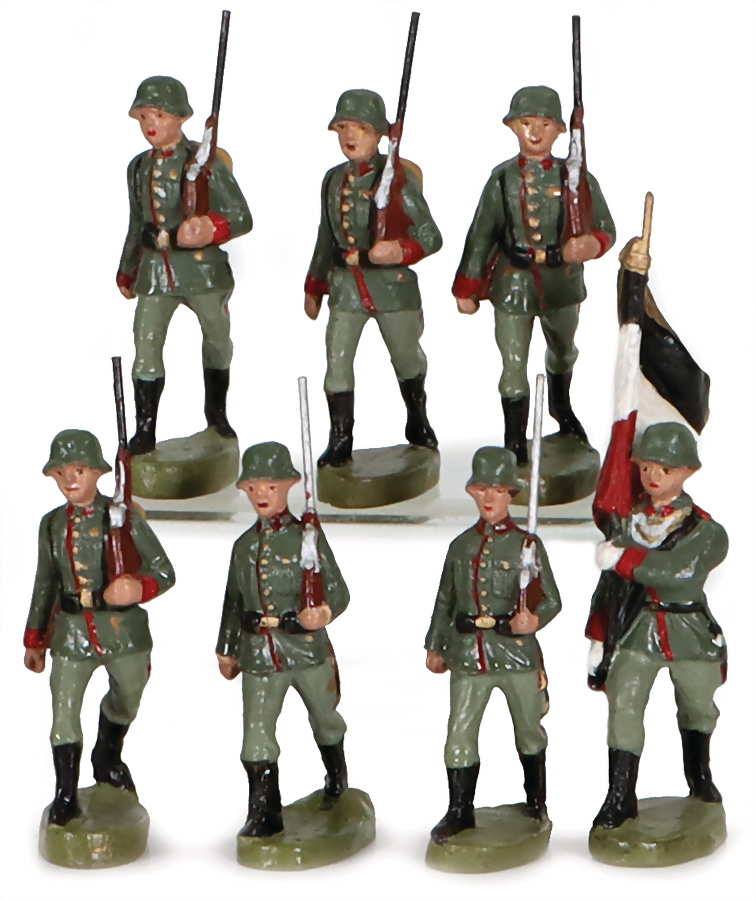 Soldaten, 2ter Weltkrieg, marschierend, 1x Fahnenträger, 7 cm Masse, meist guter Zustand, teils farblich etwas nachgebessert , 7 Art.