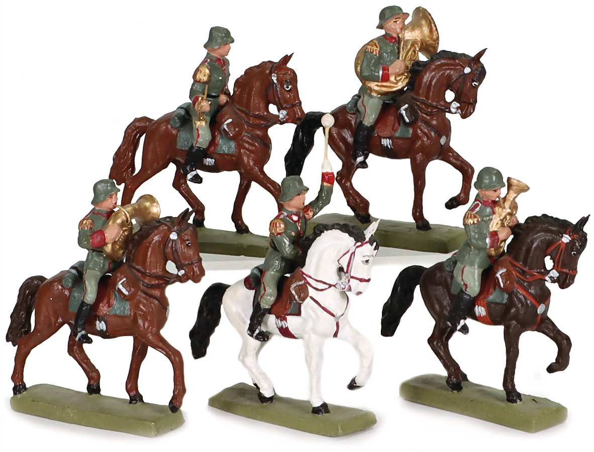 Konv. 5 Art., Pferde mit Musiker, 7 cm zu Pferd, Masse, guter Zustand, etwas farblich nachgebessert, sonst gut