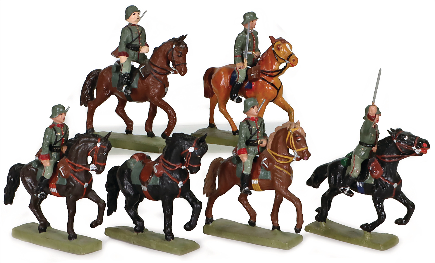 6 Art., Pferd mit Reiter, ein Reiter fehlt, Masse, 7 cm zu Pferd, farblich teils nachgebessert, sonst gut