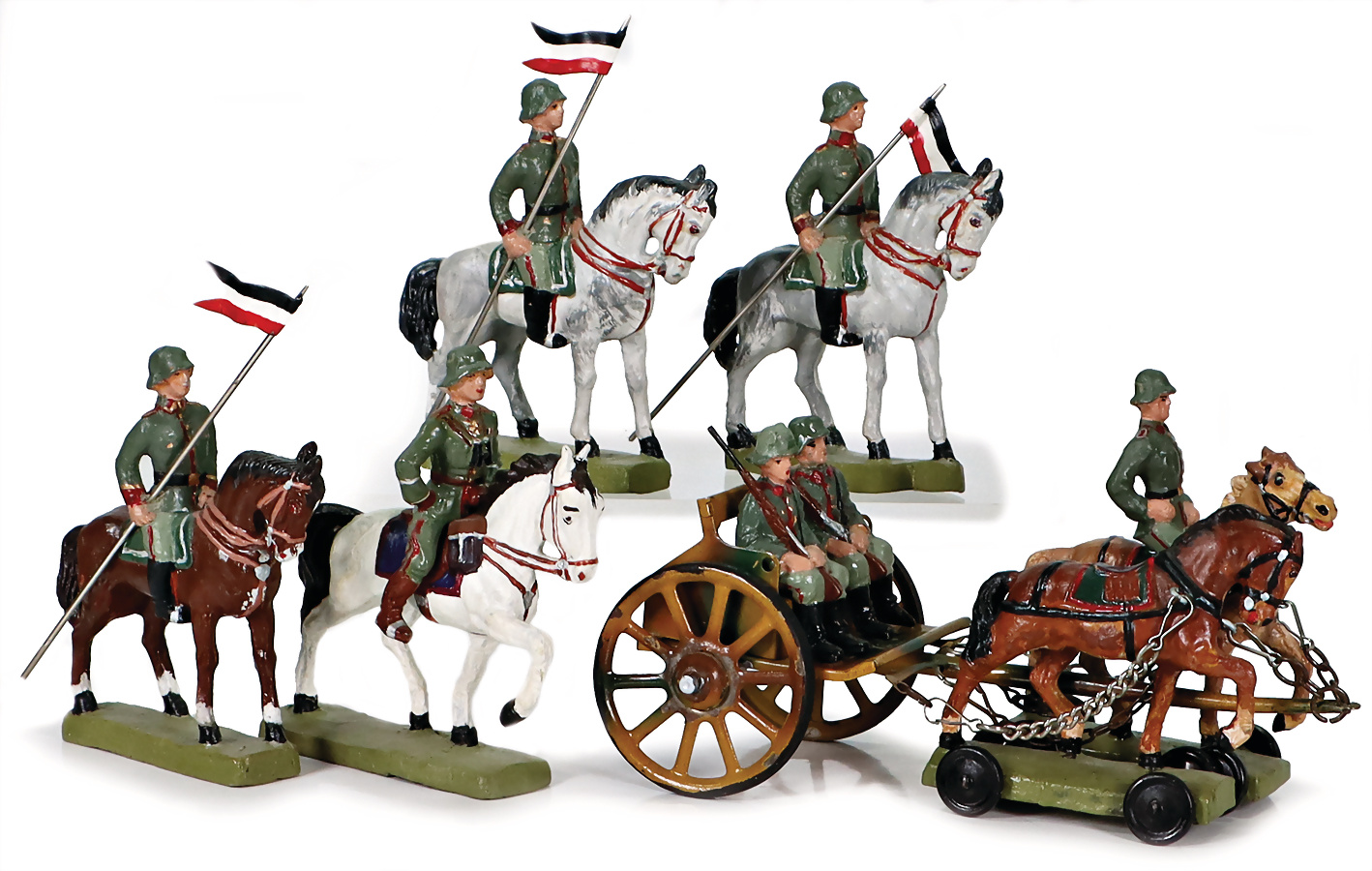 5 x Art., 3x Pferd mit Fahnenträger, 1x Pferd mit Reiter, 7 cm zu Pferd, 1x Kutsche mit 2 Zugpferden, 1x Reiter, 2x sitzende Soldaten, guter Zustand, farblich, teils etwas nachgebessert, Masse