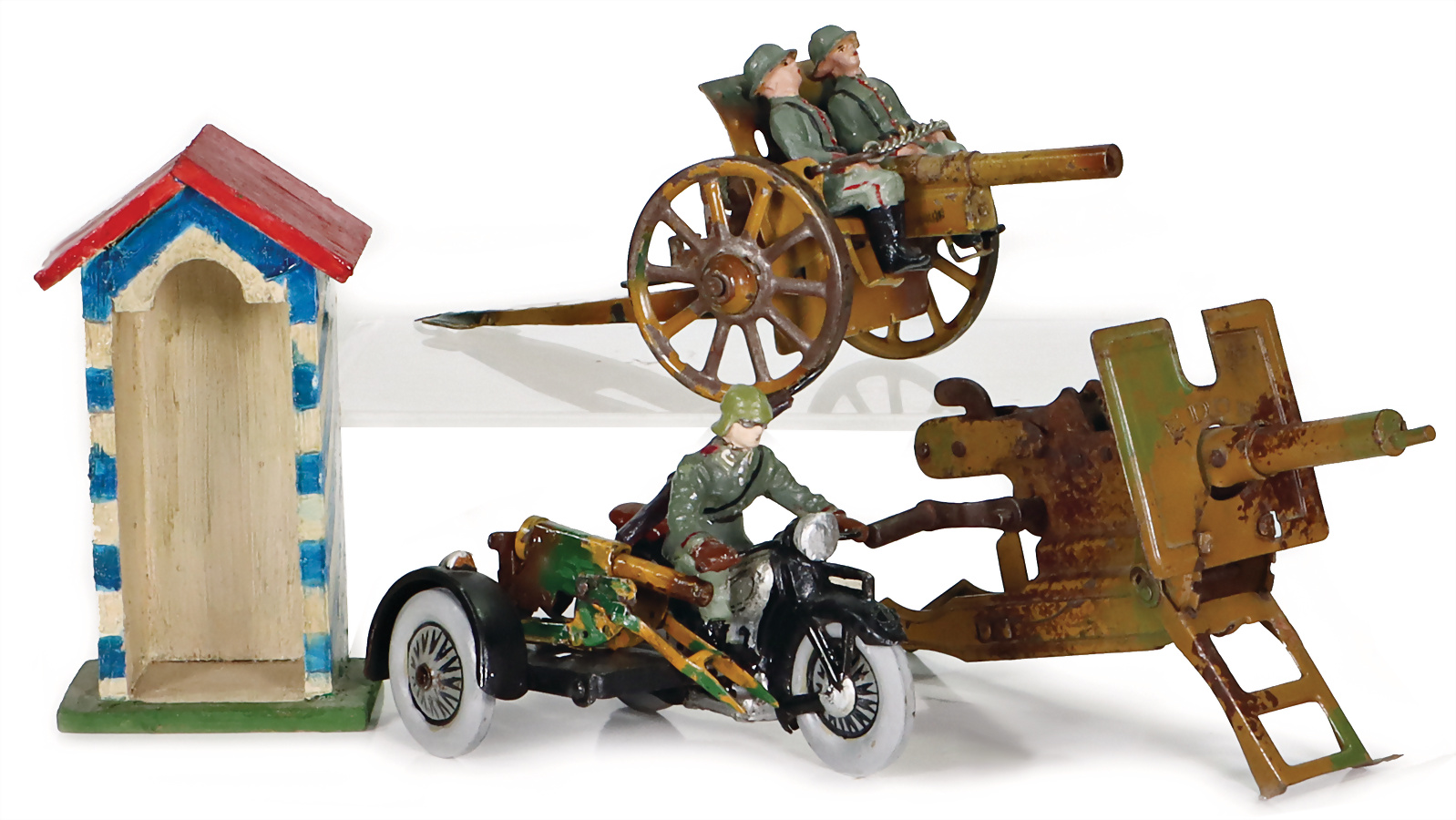 Konv., 4x Art., 1x Motorrad mit Beiwagen und Geschütz, teils farblich etwas nachgebessert, ein Wachmannhäuschen, übermalt, 1x Geschütz mit 2 Soldaten, leichter Flugrost, bespielter Zustand, Geschütz, Ersatzteilspender