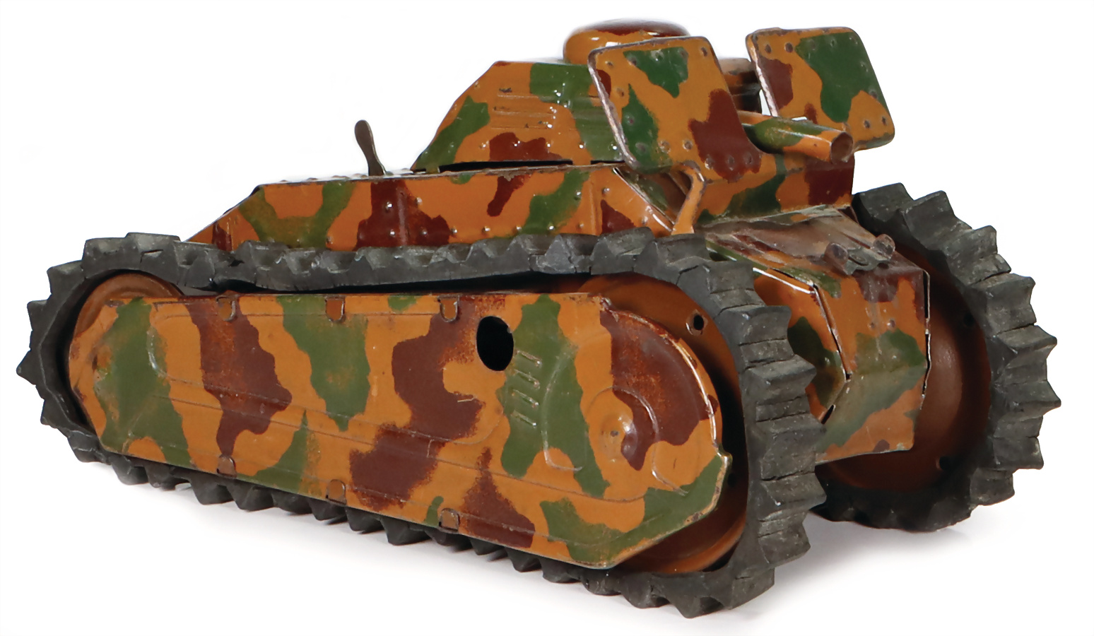 Tank, Blech, Mimikry, Uhrwerk defekt, bespielte Zustand, Gummikette altersbedingt porös, L: 20 cm, Blech litho.
