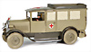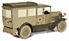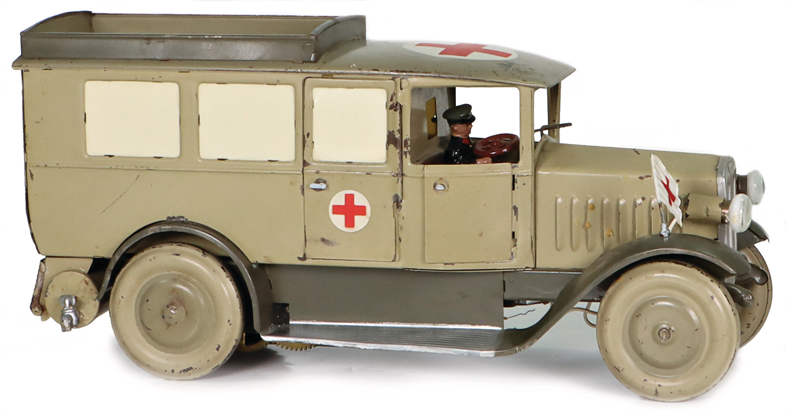 Krankenwagen, Blech, litho., altersbedingte Lackschäden, eine Fahne fehlt, rechter Radkasten defekt, L: 29 cm, Uhrwerk intakt, mit Fahrer, RW-2302