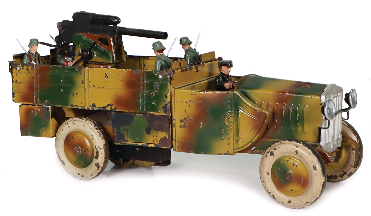 Lkw mit Geschütz, 4 Mann Besatzung, 1 Fahrer, bespielte Zustand, leichte Roststellen, Blech, litho., Mimikry, Uhrwerk intakt, L: 29 cm