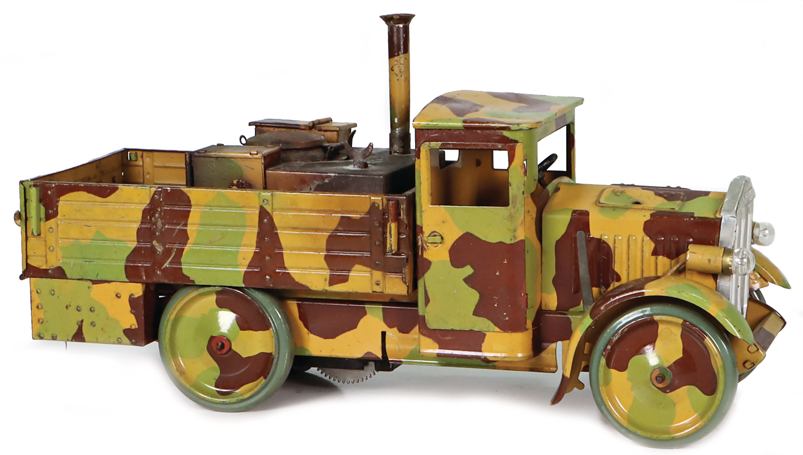 Lkw mit Feldküche, Blech, litho., Mimikry, Flugrost, bespielter Zustand, Uhrwerk intakt, L: 30 cm