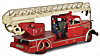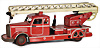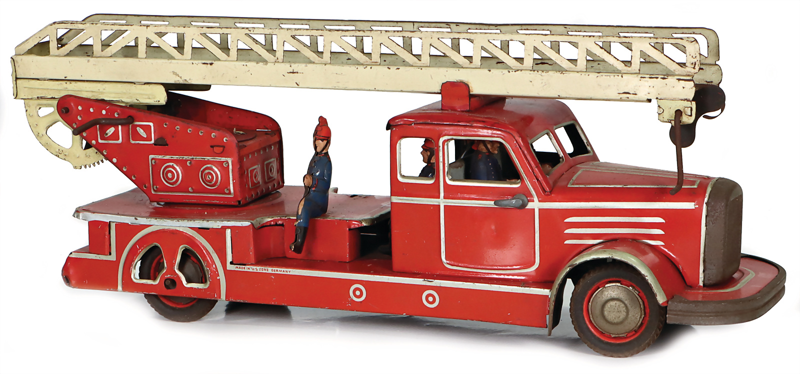 Feuerwehrwagen mit Drehleiter, Blech, lithogr., ein Feuerwehrmann fehlt, sonst komplett, altersbedingt min. Lackschäden, Uhrwerk intakt, L: 34 cm