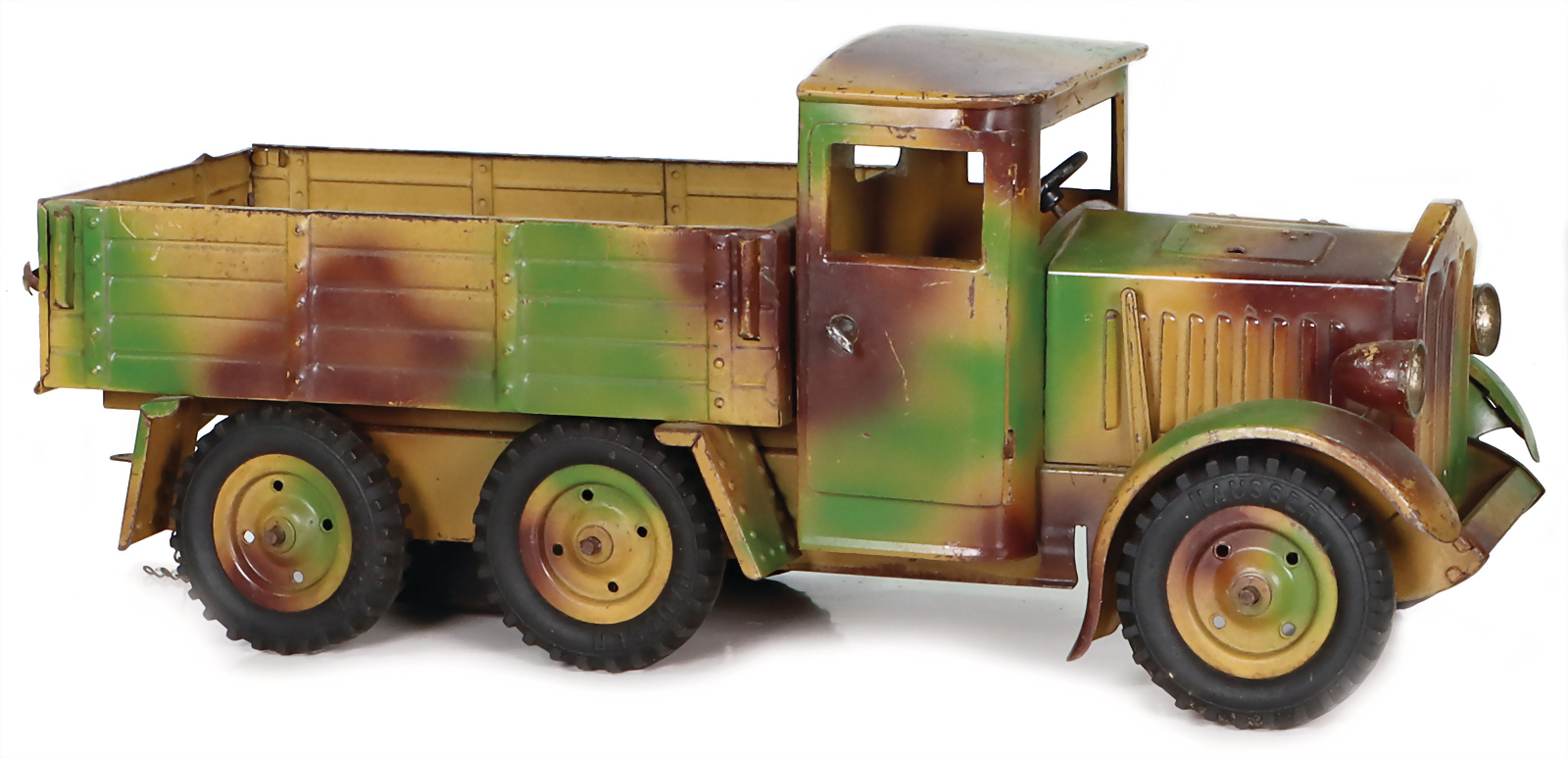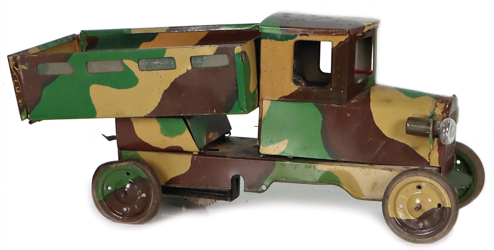 LKW Blech, Mimikry, min., Lackschäden, altersbedingt etwas verstaubt, Uhrwerk intakt, Scheinwerferlampen fehlen, L: 30 cm