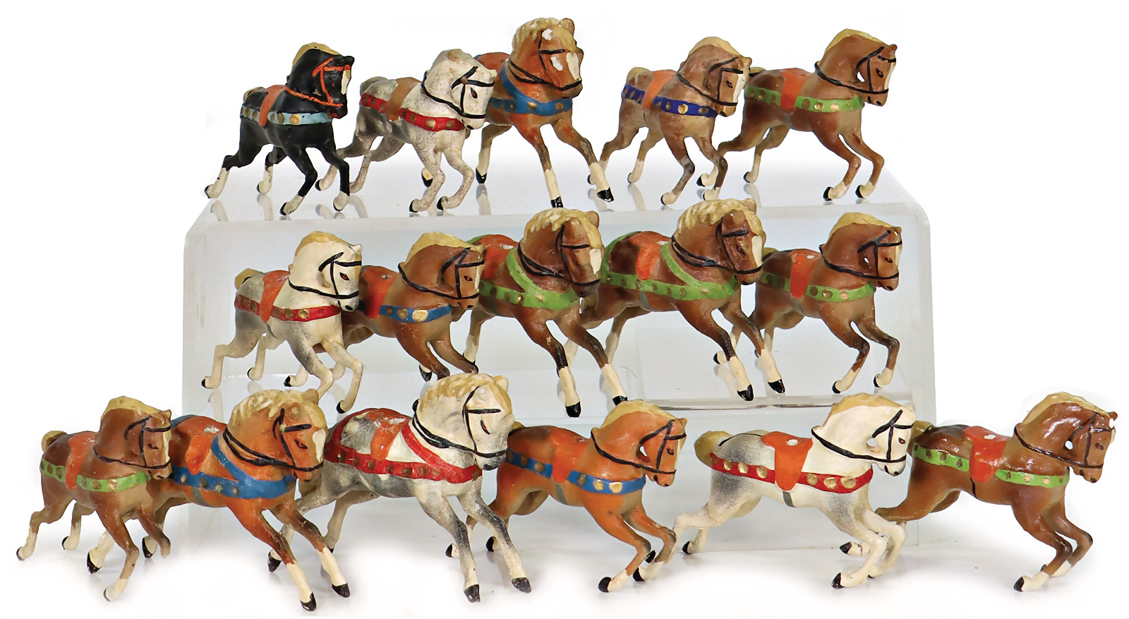 Konv. 16 Teile, Karussellpferde, H: 7 u. 7,5 cm, Masse, Lagerfund, wohl um 1925
