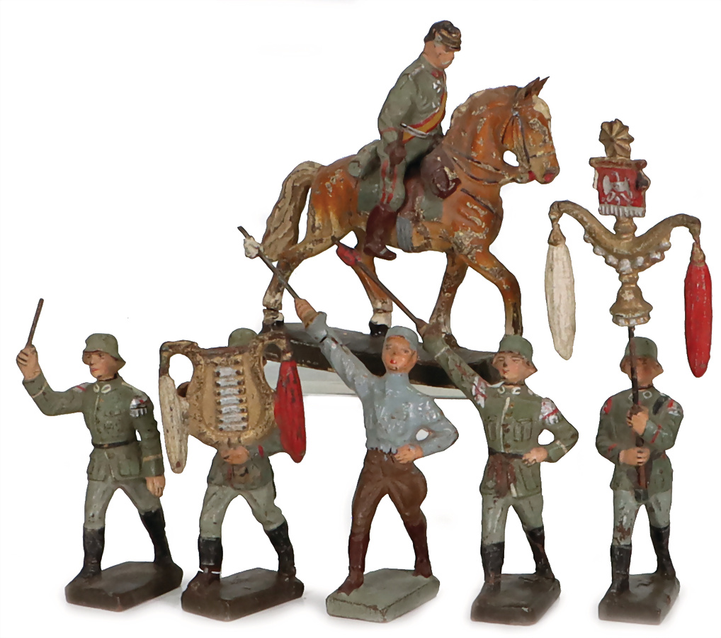 Lineol, 6 x Masse-Figuren, 2. Weltkrieg, Fahnenträger, bespielt
