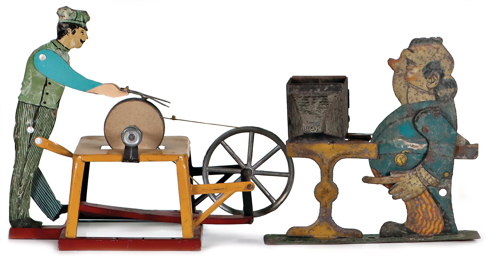 Mann mit Fotoapparat, Blech, lithogr., deutsch, Vorkrieg, 12,5 cm, stark bespielt, Flugrost, ohne Federwirkung, Antriebsmodell, Scherenschleifer, Blech, lithogr., H: 14 cm, bespielt, gut