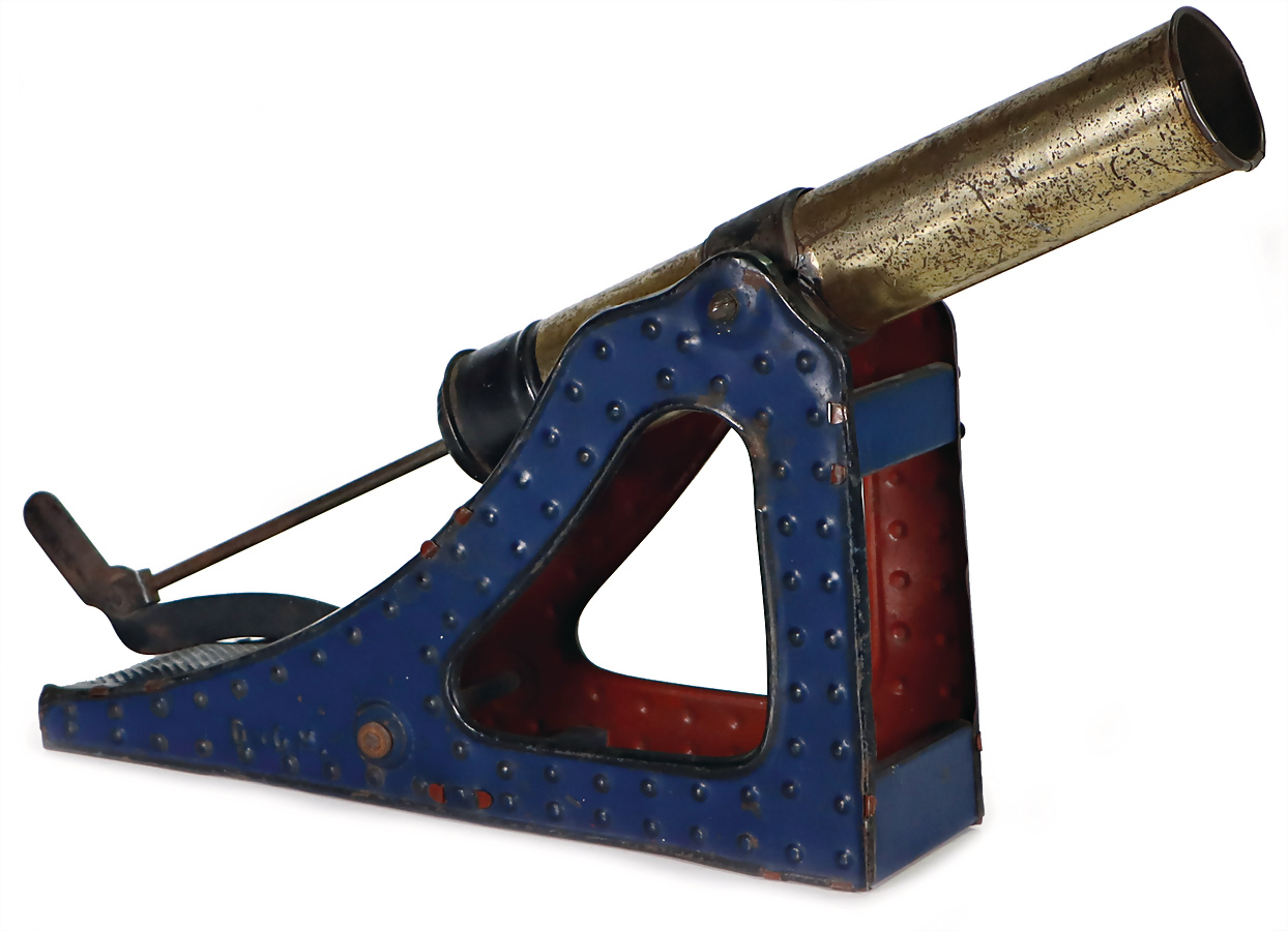 Kanone, Weißblech lithogr., gemarkt mit D.R.P.A "Deutsches Reichspatent angemeldet", ca. 1900, H: 24 cm, L: 33 cm, altersbedingte Lackfehler