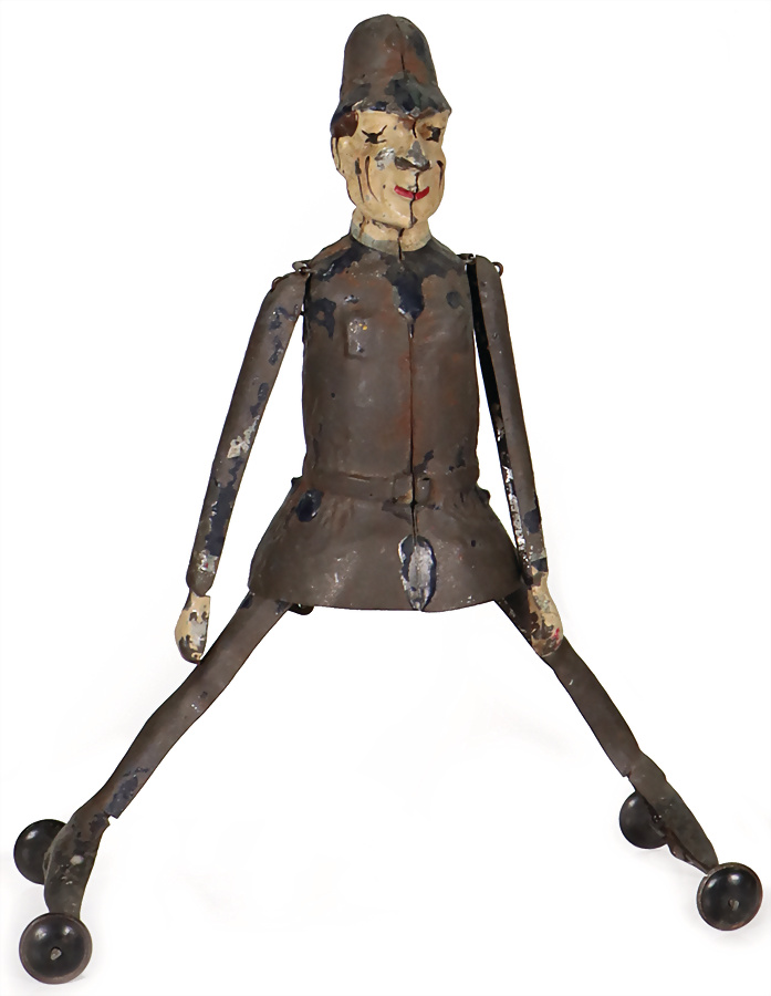 Soldat beim Drill, Blech, handlackiert, Soldat spreizt die Beine, Uhrwerk intakt, Funktion jedoch nur eingeschränkt, H: 21 cm, stärkere Lackfehler