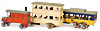 Konv. PENNY TOY, schöne Dekoration für Puppenstube oder Spielwarenladen, Schlepptender-Lok mit Wagen, im Kreis fahrend, GELY, Grundplatte 7,5x8 cm, Tender-Lok, 2 Personenwagen, 1 Güterwagen, Blech lithogr., kl. Zinn-Eisenbahn in Streichholzschachtel, „Train Express“, Frankreich