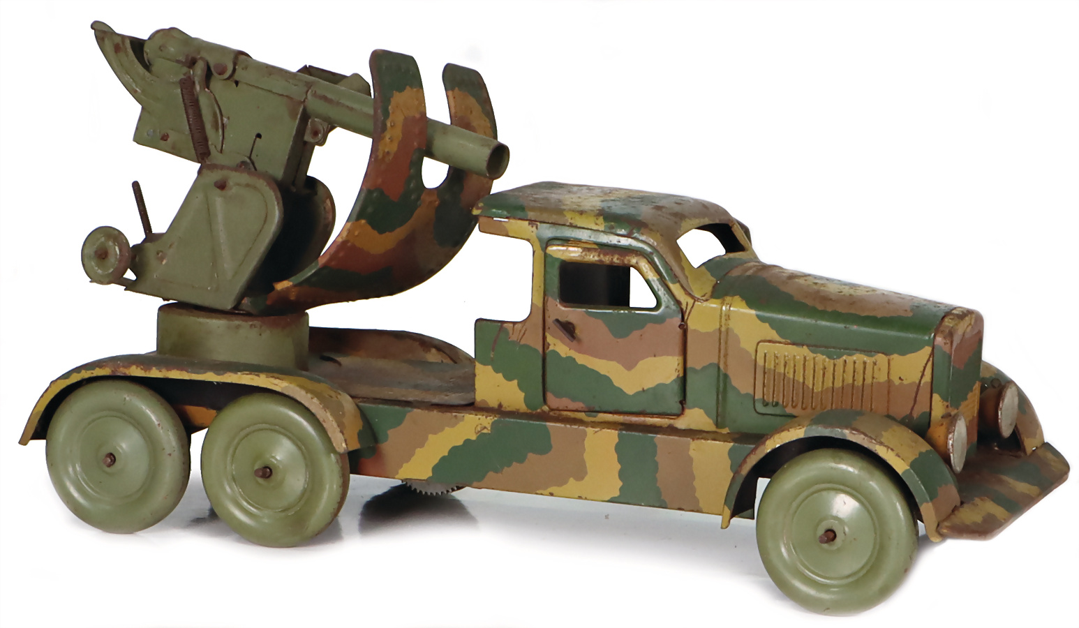 LKW mit Flakgeschütz, 3-achser, Mimikri, Blech, 33 cm, bespielt, Flugrost, Uhrwerk intakt, geht jedoch schwer