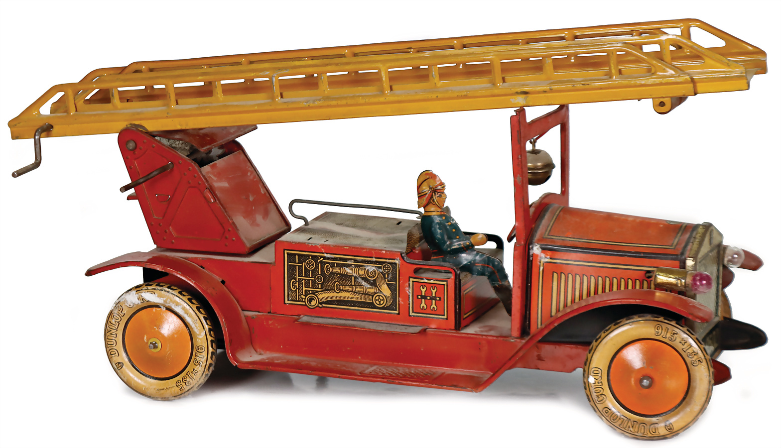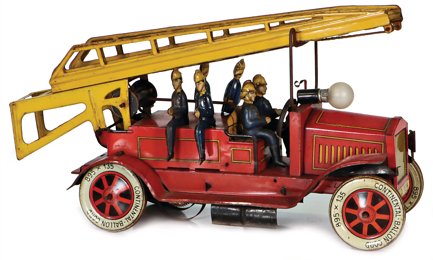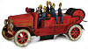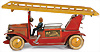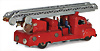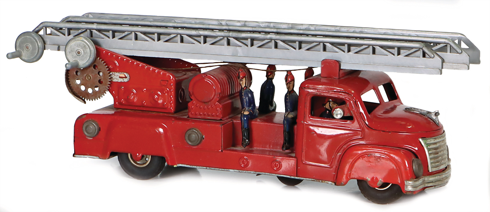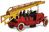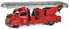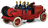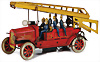 Feuerwehr, Drehleiter, Blech, Vorkrieg, lithogr., 29 cm, 6 Mann Besatzung, Frontscheinwerfer mit Batteriefach, Feder tritt beim Aufziehen aus dem Bodenblech etw. hervor, sonst Uhrwerk intakt, bespielt, gut