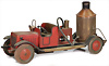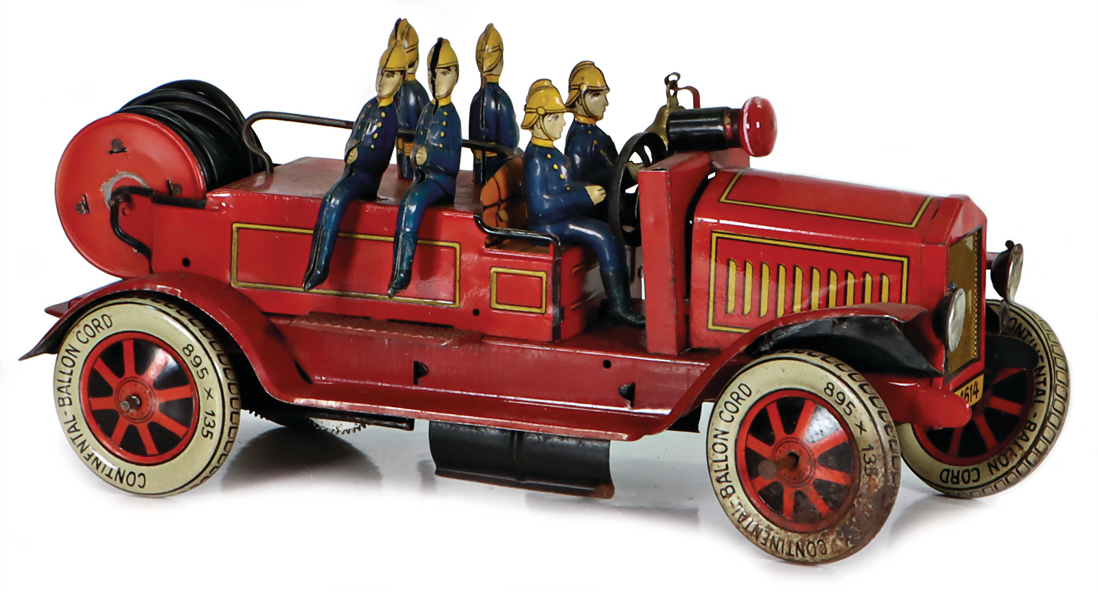 Feuerwehr, Spritzenwagen, Blech, lithogr., 52 cm, elektr. beleuchtete Frontscheinwerfer, 1 Scheinwerfer fehlt, 1 Scheinwerfer liegt lose bei, stark bespielt, Vorkrieg
