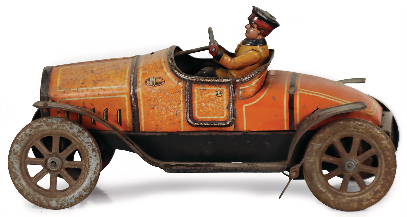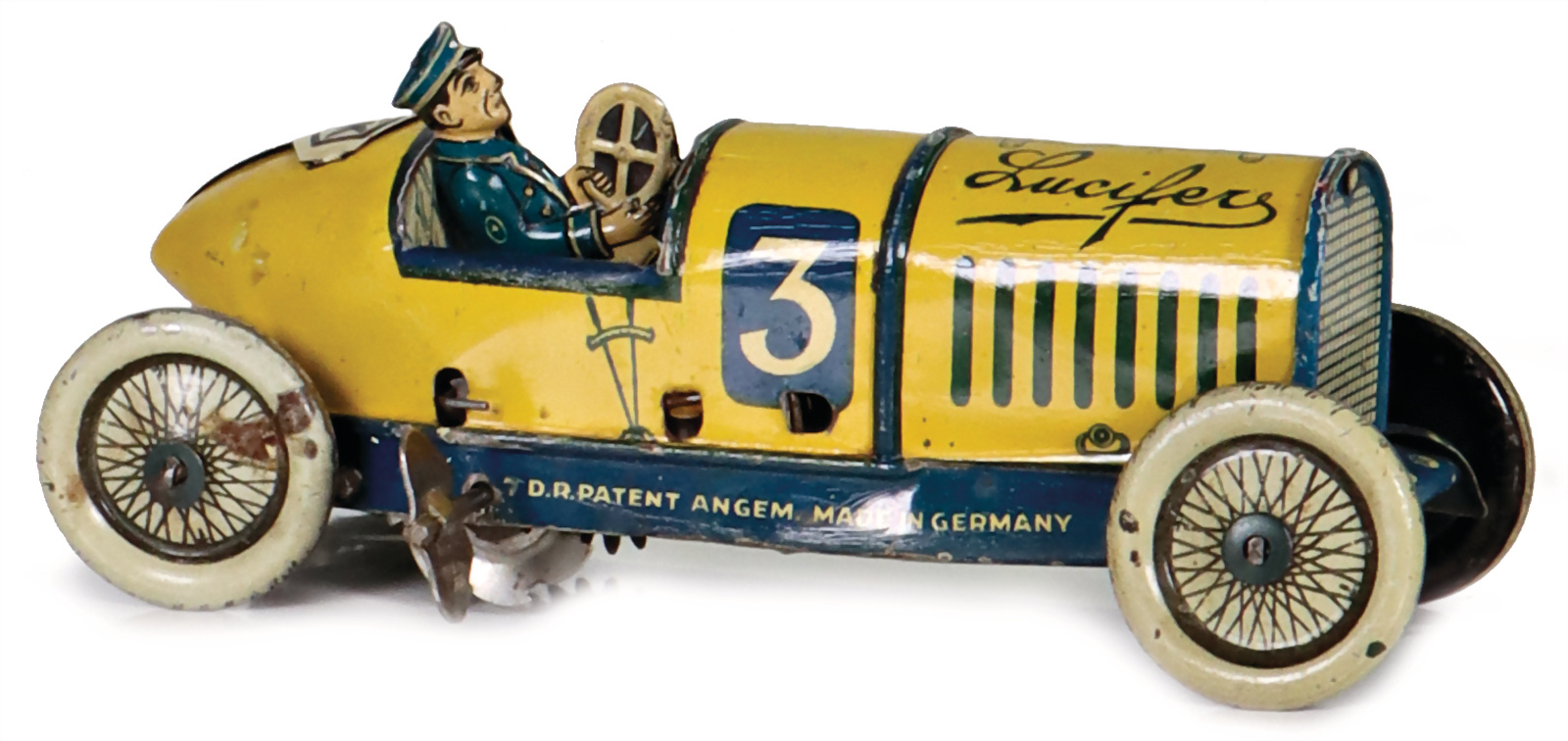 GK Lucifers, Rennwagen, Blech, lithogr., 14,5 cm, Spiralfederwerk intakt, mit Fahrerfigur, guter Zust., Vorkrieg