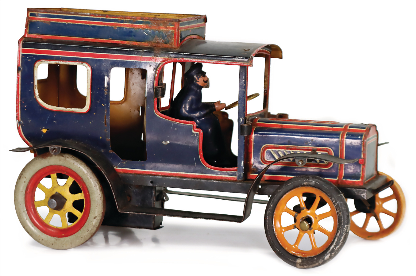 Limousine, deutsch, Blech, lithogr., mit Fahrerfigur, handlackiert, ca. 1910, gummibereift, 1 Reifen ausgetauscht, 1 Rad liegt lose bei, 1 Rad unbereift, 1 Tür sowie Scheinwerfer fehlen, Substanz gut