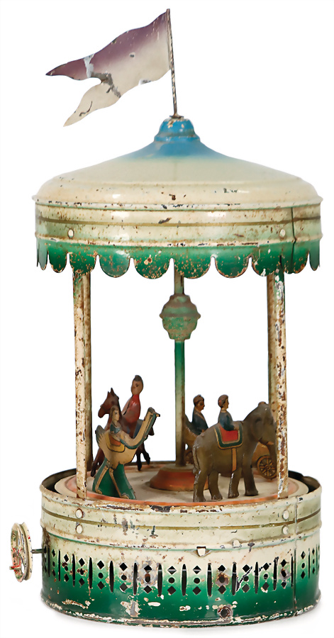 Antriebsmodell, Karussell, Blech, handlackiert, Figuren, lithogr., 32 cm, bespielt, altersbed. Lackfehler