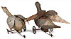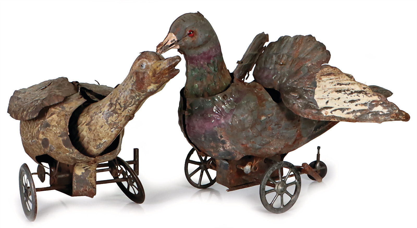 Konv. 2 Teile, Blechspielzeug, früh, Ente u. Taube, handlackiert, Taube, Uhrwerk intakt, jedoch Mechanismus muss gerichtet werden, H: 15,5 cm, Ente, Uhrwerk klemmt, L: 22 cm, bespielt, Lackfehler