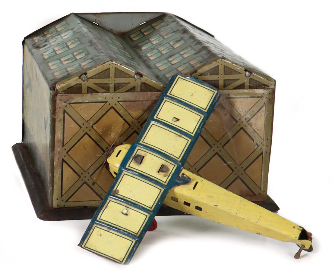 Flugzeughalle, mit Flugzeug, Blech, lithogr., Grundplatte 13x12 cm, mit Flugzeug, Vorkrieg, bespielt