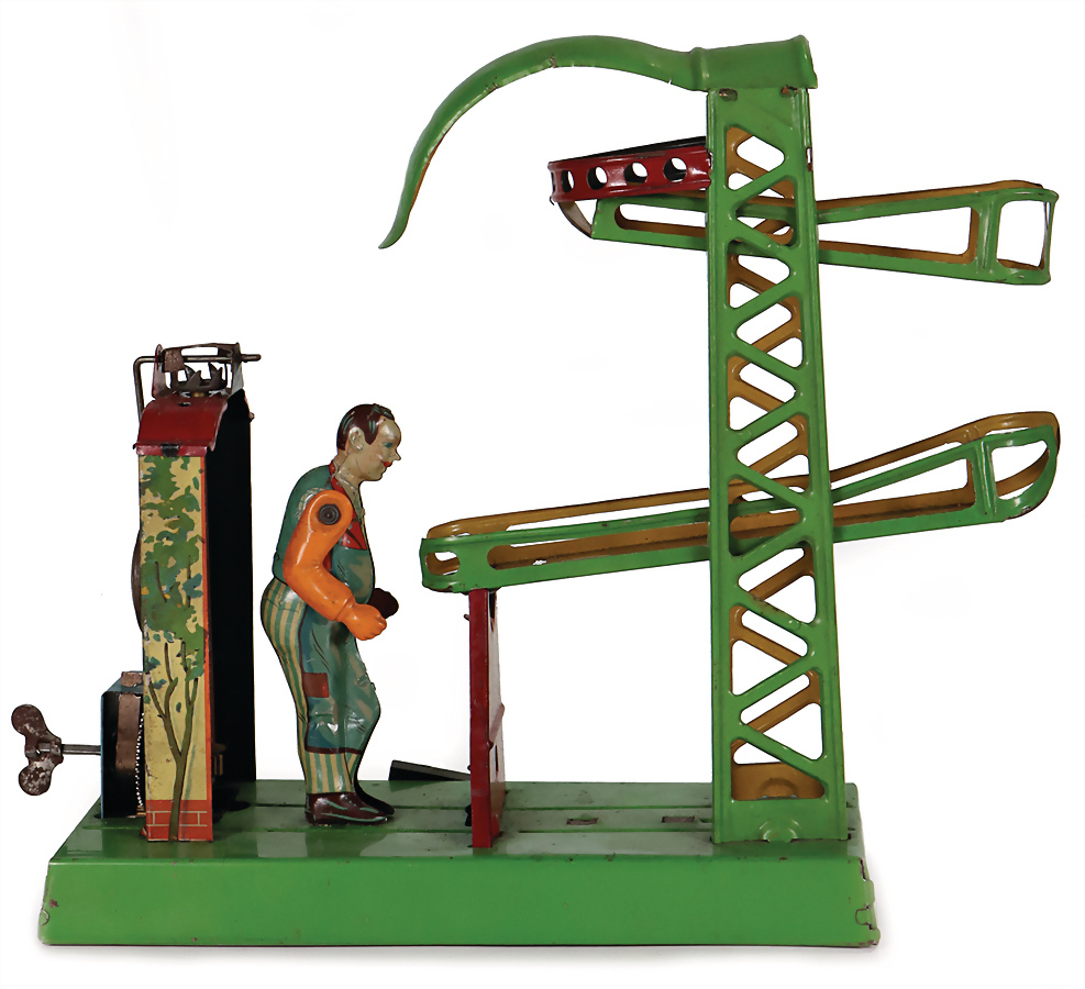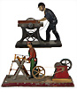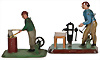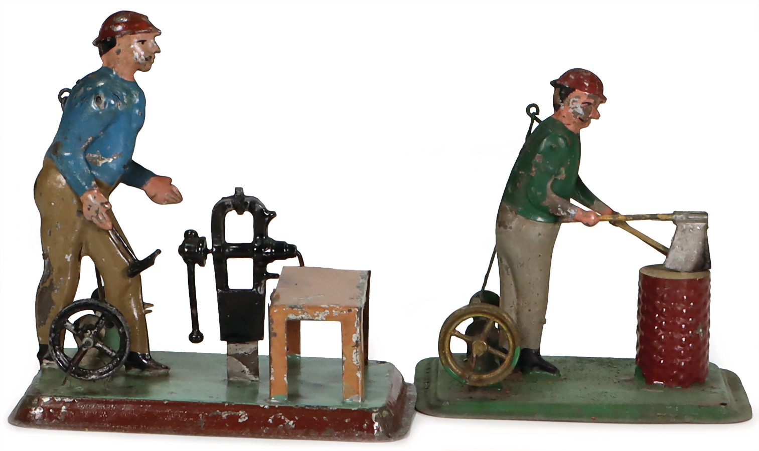 2 Teile, Antriebsmodelle, Blech, handlackiert, Mann am Schraubstock, H: 12,5 cm, Mann mit Beil, H: 11 cm, bespielt, gut