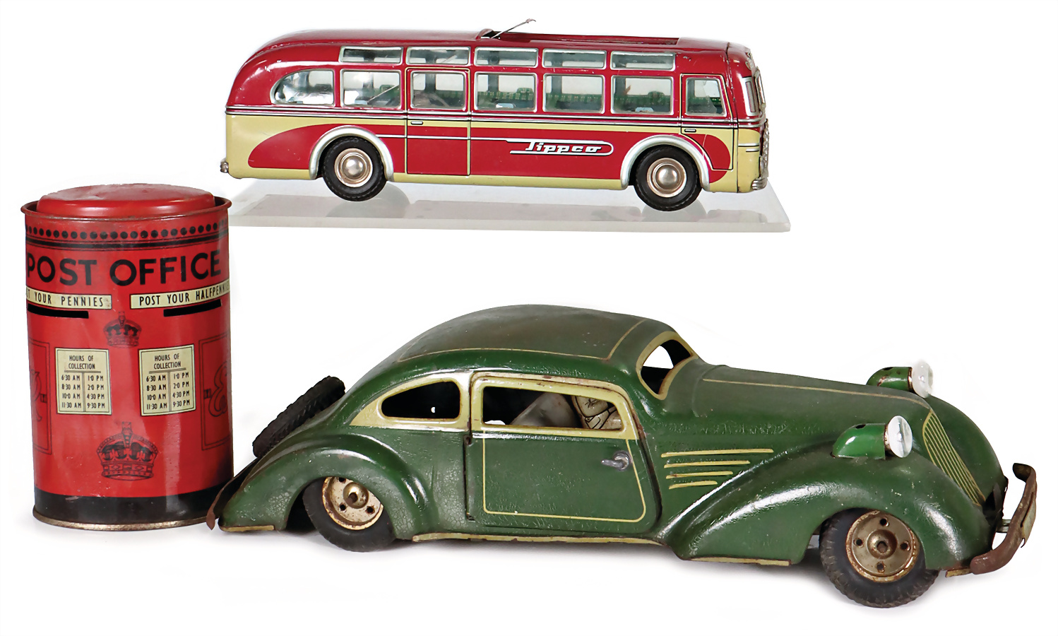 Limousine, Blech, lithogr., deutsch, Vorkrieg, 31,5 cm, elektr. beleuchtete Frontscheinwerfer, Uhrwerk klemmt, Antriebsachse muss neu befestigt werden, beide Türen zum Öffnen, mit Fahrerfigur, TIPP&CO Bus, mit Oberlichtern, 24 cm, Blech lithogr., Uhrwerk intakt, bespielt, gut, 1 Spardose, Briefkasten, England, 13 cm