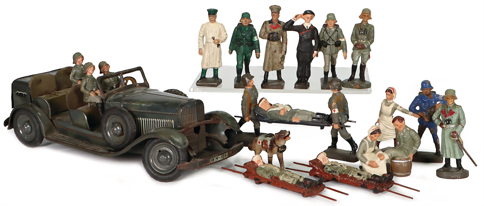 Mercedes, mit Kardanwelle, Blech, lithogr., 20,5 cm, 3 Fahrerfiguren, Stern fehlt, Uhrwerk intakt, klemmt jedoch ein wenig, einige Lazarettfiguren, LINEOL, 7,5 cm, 2. Weltkrieg, 2 Figuren, ELASTOLIN, Zust. 2-3